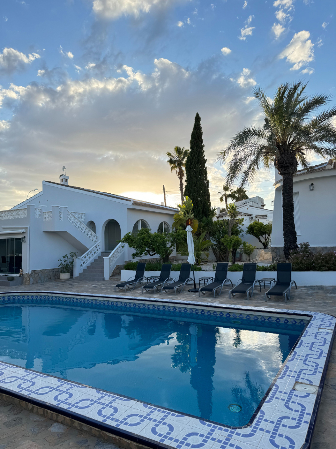 Eiendommen består av tre hus i en vakker hage. Midt mellom husene, i hjertet av eiendommen, finner du et stort svømmebasseng, utekjøkken og BBQ, og en rekke sitte og liggeplasser. Her kan du både søke fellesskap, men også et eget lite stille sted.